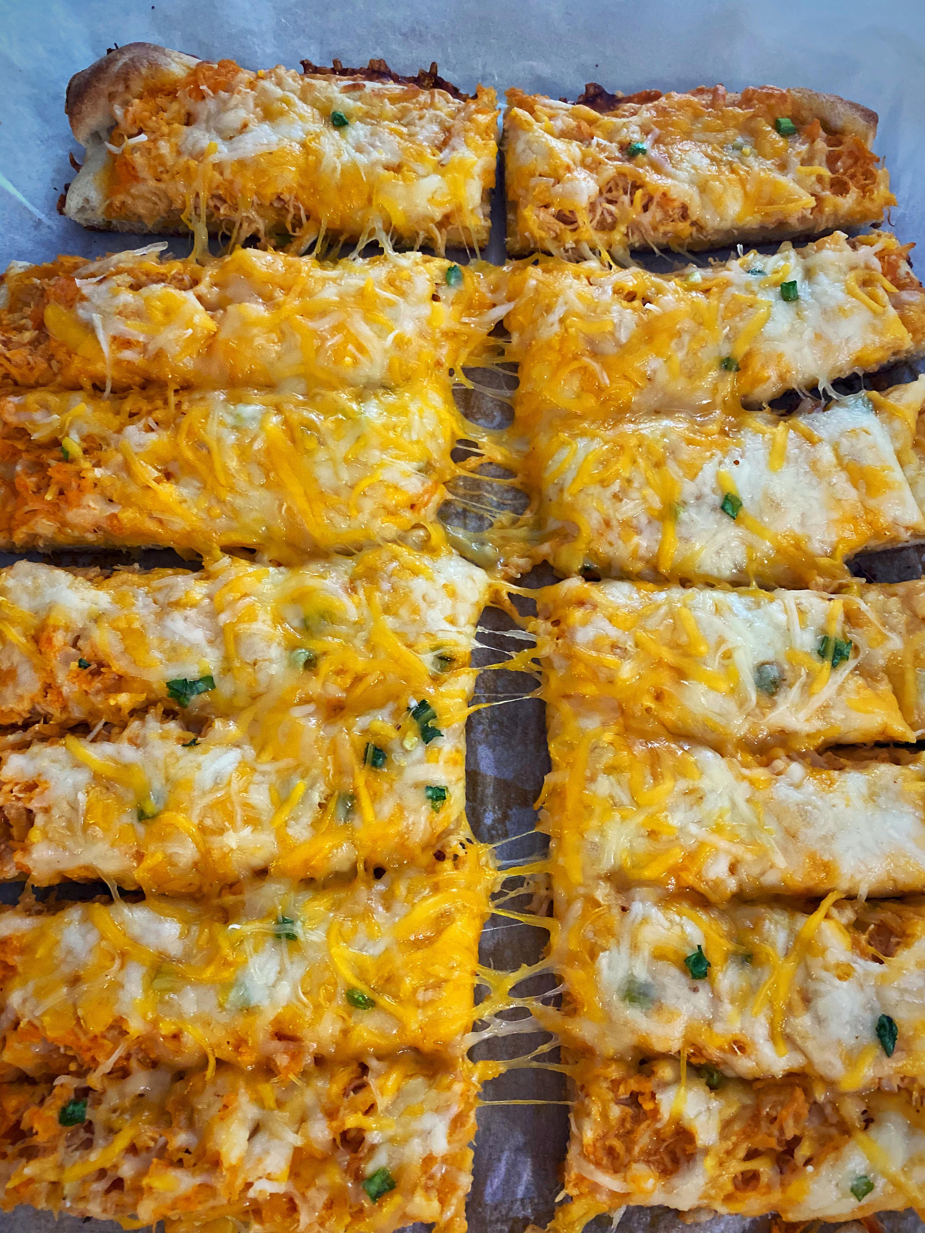 Evenly spread the buffalo chicken over the baked pizza crust then scatter the cheddar cheese,
