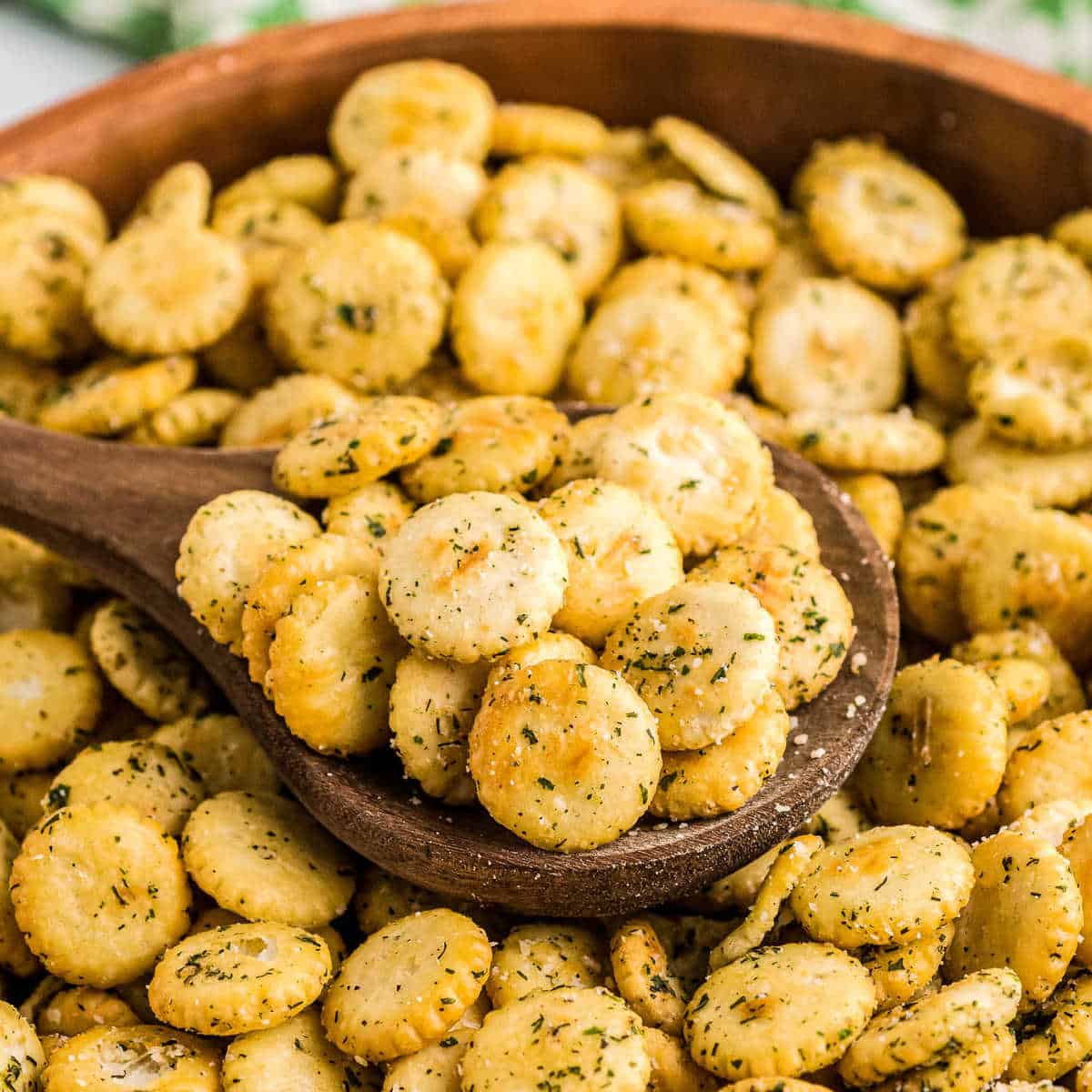 - Combine dressing mix with herbs & oil. Pour over crackers.