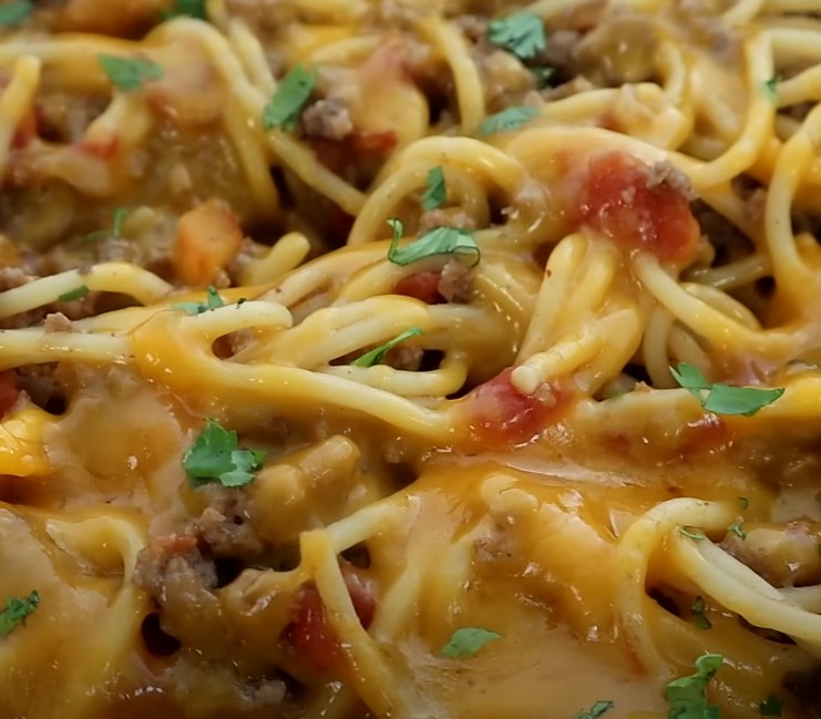 - Add spaghetti on top of mixture laying it flat in one layer